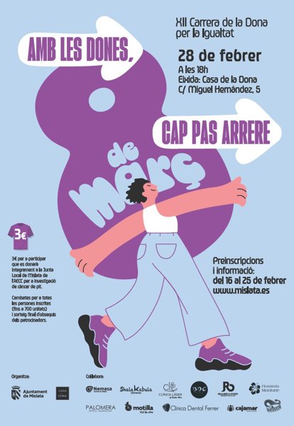 Preinscripcions: en www.mislata.es. Del 16 al 25 de febrer. Recollida de dorsals: 26 i 27 de febrer, de 9 a *14h i de 16 a 20.*30h, col·laborant amb 3 € solidaris, destinats a *AECC-Junta Local de Mislata (projectes destinats a combatre el càncer de mama).